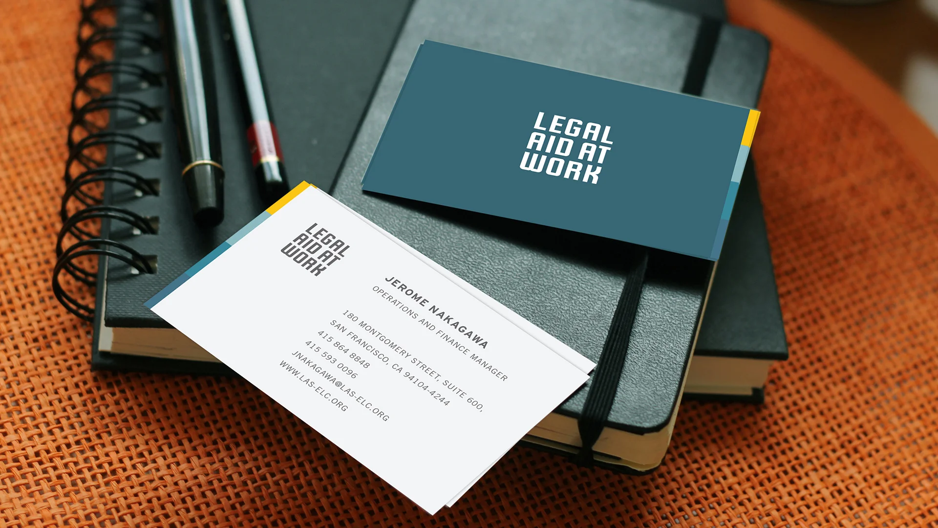 Clean and direct style also applied to the Legal Aid at Work business card design. Minimizing the text color to the primary color blue with a stripe of secondary colors on the edge to represent the branding concept.